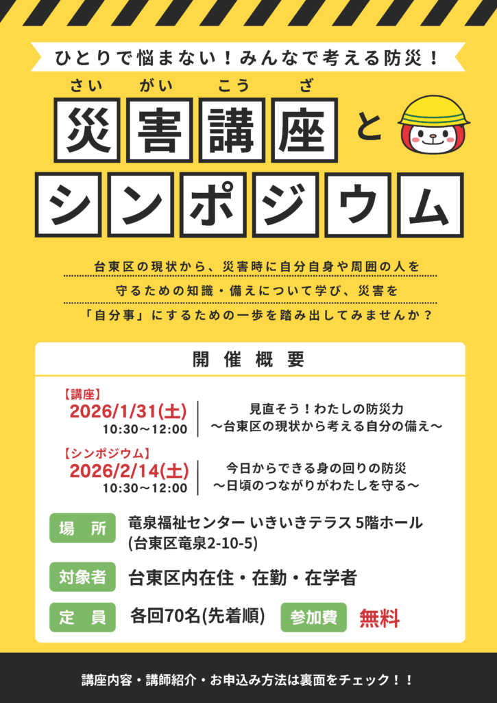 災害講座は2026年1月31日(土)10:30~12:00・申込締め切り:2026年1月25日(日)、シンポジウムは2026年2月14日10:30~12:00申込締め切り:2026年2月8日(日)となります。お申し込みは各回で可能です。両日ともに団体理事長金子が登壇致します。皆様のお申し込みをお待ちしております。災害講座とシンポジウムの詳細、お申し込み先はチラシをご覧下さい。